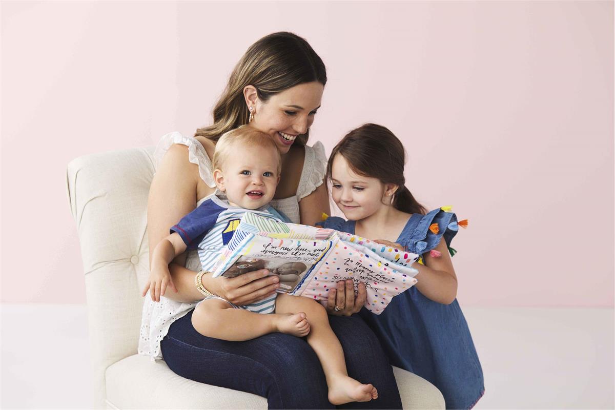 Soft baby safe album includes vinyl sleeves to hold personalized photos.
